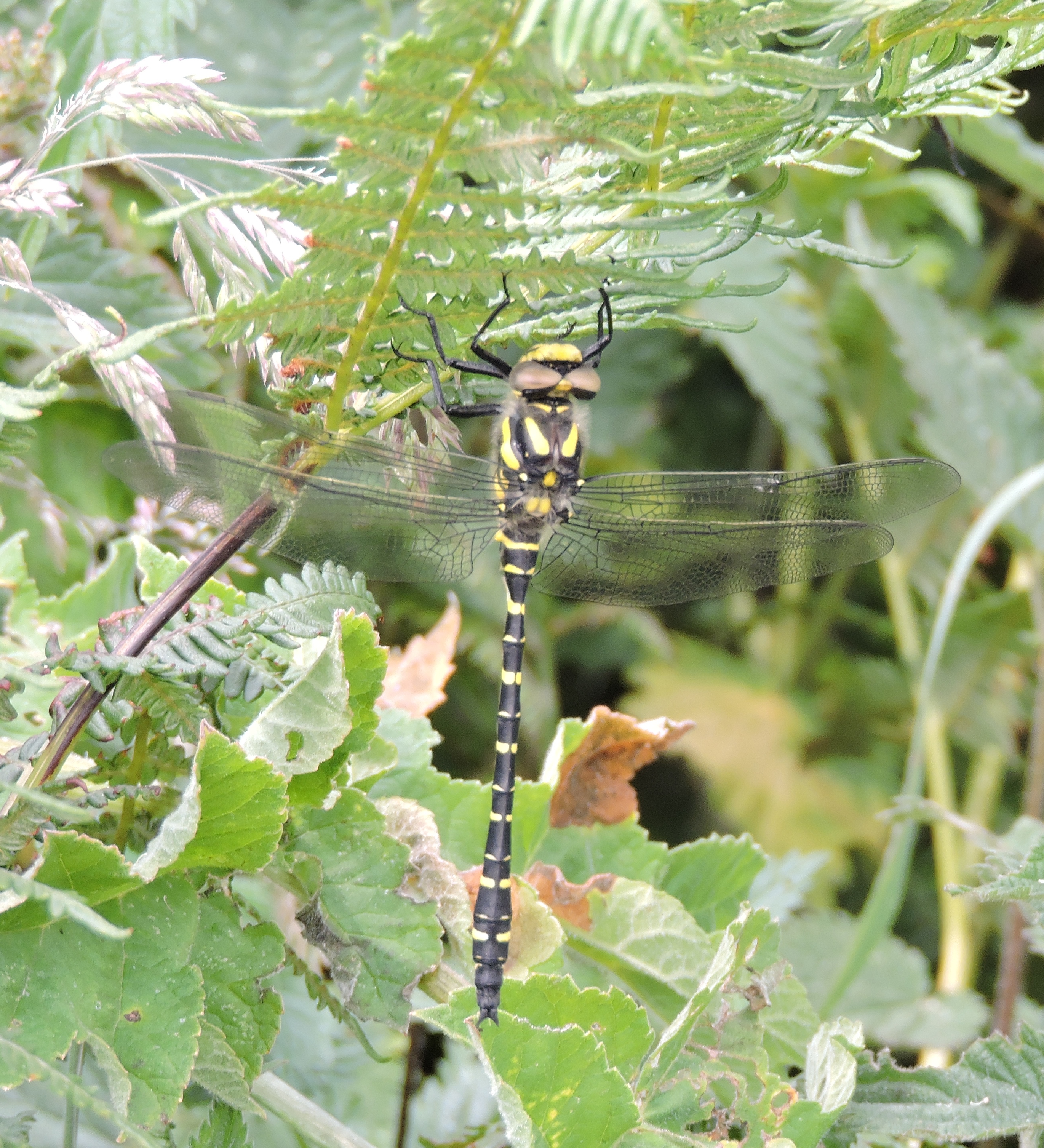 And then we see an enormous dragon fly. I fail to get him on camera but Mr RR spots a second one and as he lands, swoops in for a picture. It’s a beauty – a Common Goldenring (or Golden-ringed) Dragonfly. These can be up to 85mm long and this one probably is! See how he’s hanging on to the underside of the fern with his tiny feet, and look at those wings – like gossamer: