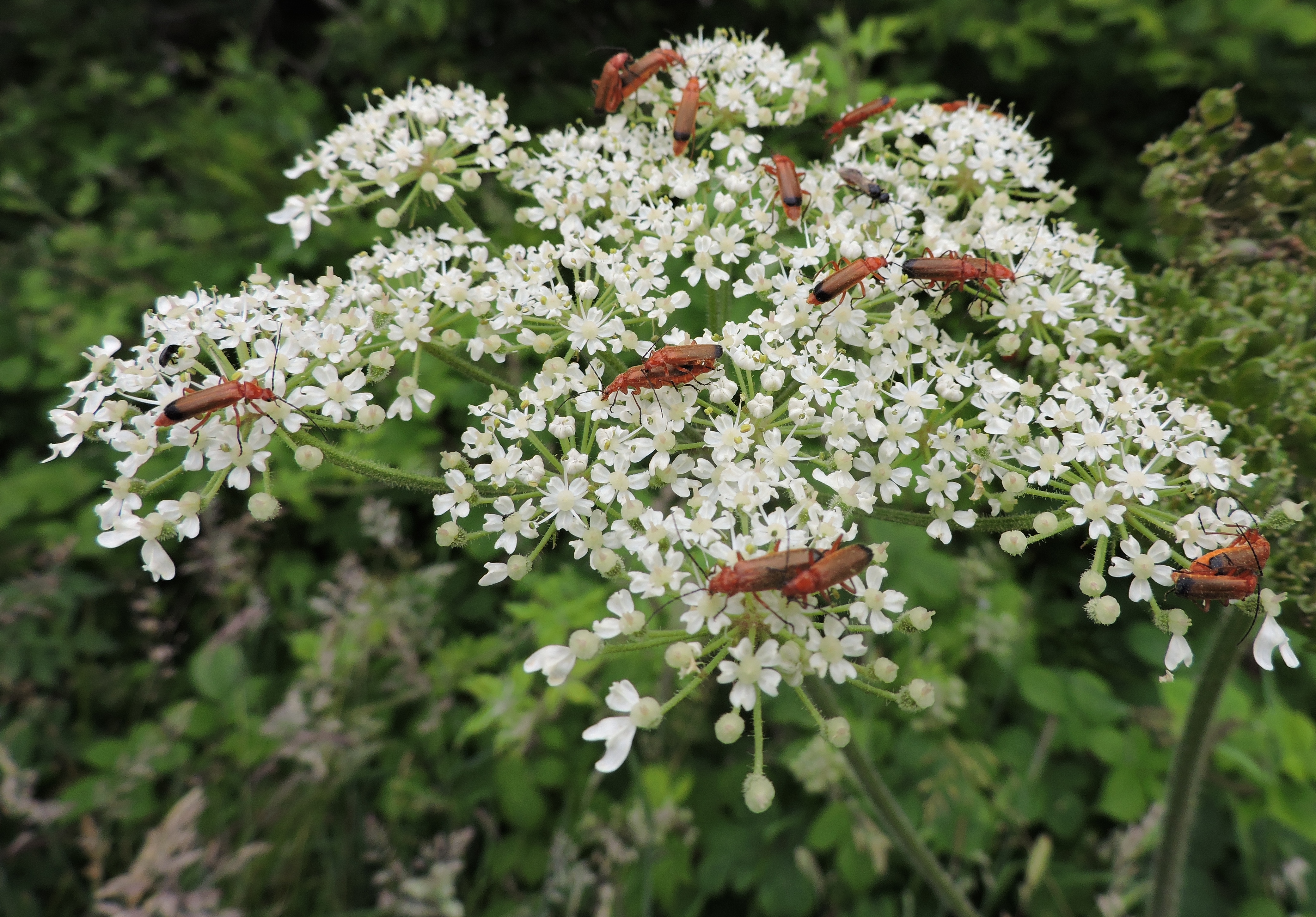 These are Common Red Soldier Beetles – quite small but easily seen on this hogweed because there are so many of them. Because of the colour, they’re often known as bloodsuckers but they are, in fact, quite harmless to humans. My insect book tells me that they are abundant in flowery places, especially around umbellifers such as this hogweed and are frequently seen as mating pairs – as here!