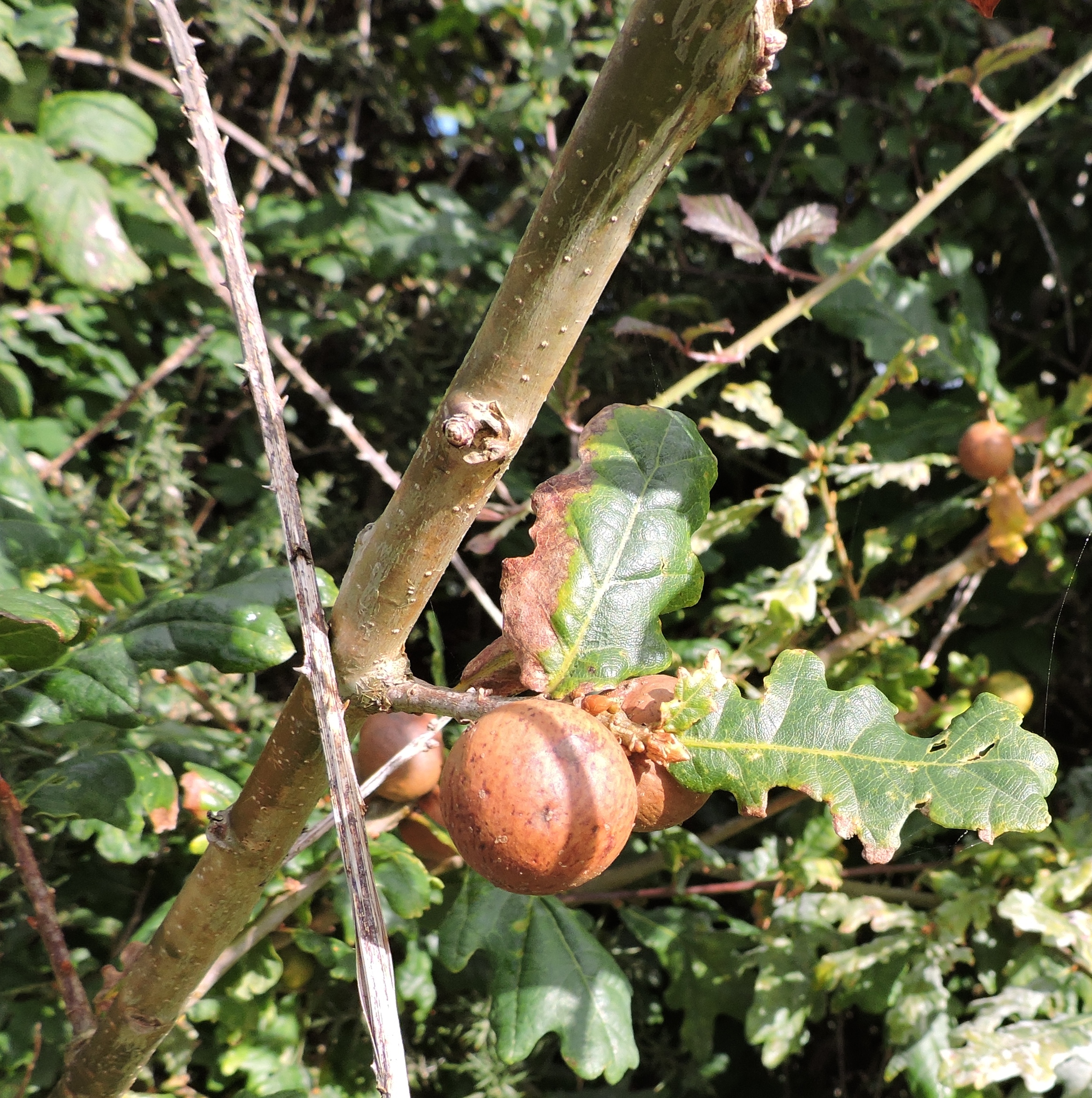 These are Oak apples – a soft spongy ball found on the end of Oak tree twigs. Inside the apple is divided into cells and in each cell lives a grub, destined to become gall-wasps or flies very soon!